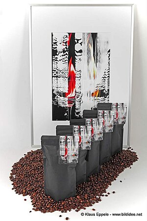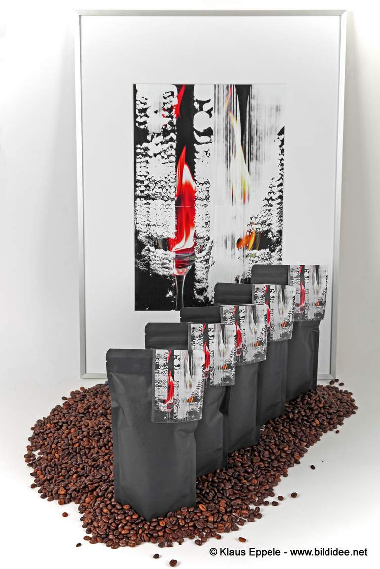 Das Röstwerk Herzogkaffee aus Waldbronn hat speziell für unser Projekt „Fotos | Farbe | Fantasie.“ einen eigenen Kaffee kreiert, den unsere übermalte Fotografie „HeissKalt“ im Label ziert: Eine besondere Cuvée der ausgewählten Premiumkaffees Coffea Arabica aus Brasilien und einem kräftigen Coffea Canephora aus Indien.