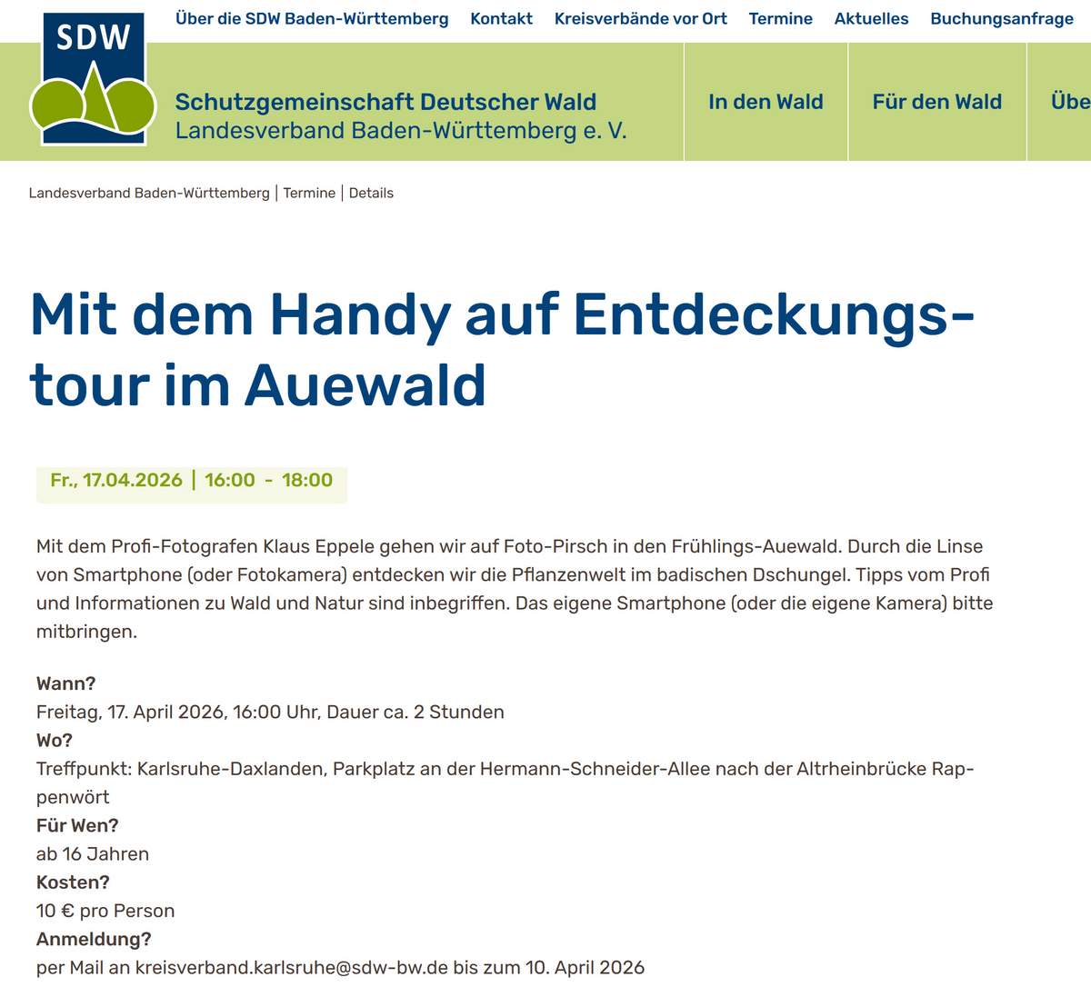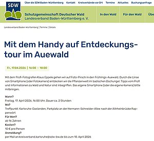 Am 17. April 2026 bietet die Schutzgemeinschaft Deutscher Wald e.V. einen Spaziergang durch den Auewald an bei dem der ehemalige Forstamtsleiter Ulrich Kienzler Wissenswertes über den Wald und die Natur erklärt und ich den Teilnehmern zeige, wie man beides optimal fotografiert.