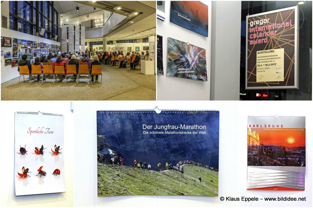 Eröffnung der "Gregor International Calendar Award 2017"-Ausstellung heute Abend im Regierungspräsidium Karlsruhe. Mit dabei: Meine vier Kalender: - Karlsruhe - Facetten und Perspektiven einer interessanten Stadt - Sportliche Tiere - Der Jungfrau-Marathon - heimgeSucht (der den gregor self-publishing calendar award 2017 in der Kategorie „Essen & Trinken, Lifestyle“ erhalten hat)