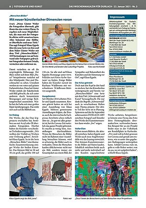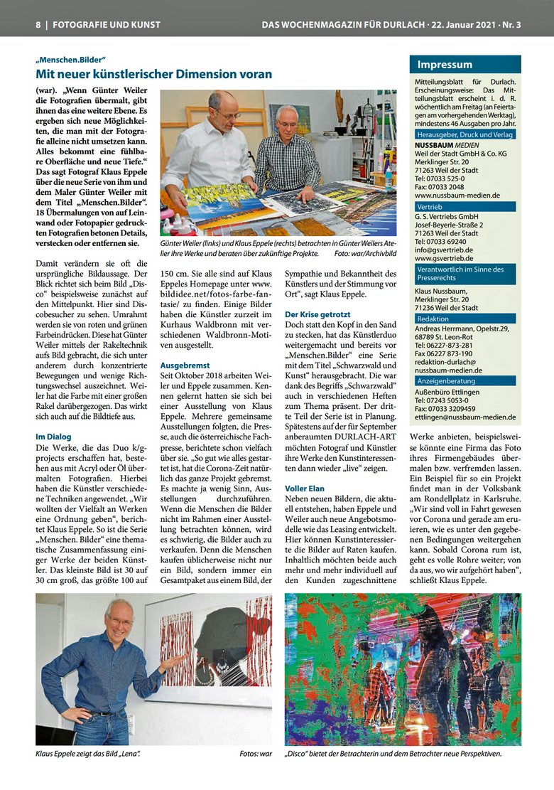 Der Fotograf Klaus Eppele hat einige seiner Fotografien ausgewählt und auf unterschiedliche Medien verschiedener Größen drucken lassen. Diese hat der Maler Günter Weiler aus Waldbronn künstlerisch bearbeitet. So entstand im Rahmen des gemeinsamen FOTOS | FARBE | FANTASIE.-Projekts eine neue Bilderserie, die Menschenbilder und Kunst miteinander verbindet.