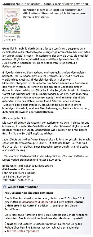 Durlacher.de verlost ein Exemplar unseres neuen Buchs "Glücksorte in Karlsruhe" unter https://bit.ly/2OBoAoW
