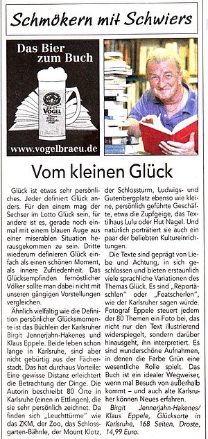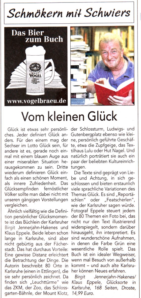 Einladung Birgit liest aus unserem Buch „Glücksorte in Karlsruhe“ und berichtet über die Entstehung des Buches. Wann: Am 1. Oktober 2018 um 18 Uhr Wo: Zuckerbecker, Werderstraße 34, 76137 Karlsruhe Es sind nur noch wenige Plätze frei. Anmeldung bitte an birgit@jennerjahn.de