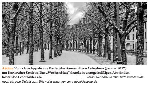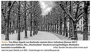 Fotoausstellung der Hoepfner-Stiftung Vernissage: 24. Januar 2017, 18 Uhr Ausstellungsdauer: 25. Januar – 09. März 2017 Ort: Industrie- und Handelskammer, Lammstraße 13, 76133 Karlsruhe Öffnungszeiten: Mo – Do 7 – 18 Uhr, Fr 7 – 14.30 Uhr Gezeigt werden die Siegerbilder des Fotowettbewerbs 2016 – und drei Fotografien von mir sind mit dabei (5. Platz).