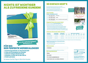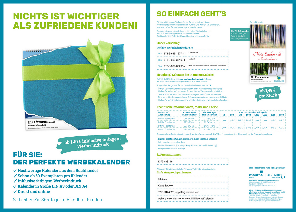 Alle meine Kalender (siehe: www.bildidee.net/kalender) gibt es jetzt in einer etwas einfacheren Ausführung auch als Werbekalender mit individuellem Werbeeindruck zu sehr günstigen Preisen (ab 1,49 Euro pro Stück). Genauere Informationen findet man hier: