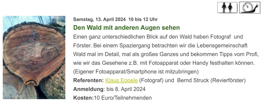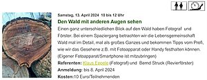 Im April können Sie mit unserem Förster Bernd Struck und mir eine Runde durch den Wald spazieren, von Bernd viele interessante Dinge über den Wald erfahren und von mir ein paar Tipps bekommen, wie man diese interessanten Dinge am besten fotografiert. Siehe auch: https://www.waldpaedagogik-karlsruhe.de/jahresprogramm/april/