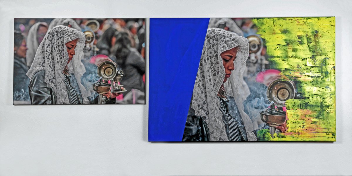 Links sehen Sie eine Szene, die ich an Fronleichnam in Cusco, Peru aufgenommen habe (Leinwand, 70 x 105 cm) und rechts das gleiche Motiv als eine von Günter Weiler übermalte Fotografie aus unserer Serie Fotos | Farbe | Fantasie. (Leinwand, 100 x 150 cm) (siehe auch: https://www.bildidee.net/fotos-farbe-fantasie/).